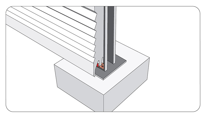 Po zamontowaniu wypoziomowanych zetowników podtrzymujących do słupów można przystąpić do montażu płyt. Wypust zewnętrzny zetownika powinien wejść we wpust zewnętrzny (zakryty noskiem) płyty. Kiedy płyta spocznie całym swoim ciężarem na zetownikach, mocuje się ją od góry do słupa używając zestawu dystrybutor obciążenia i 2 łączniki na jeden punkt mocowania (zob. opis na stronie następnej).
