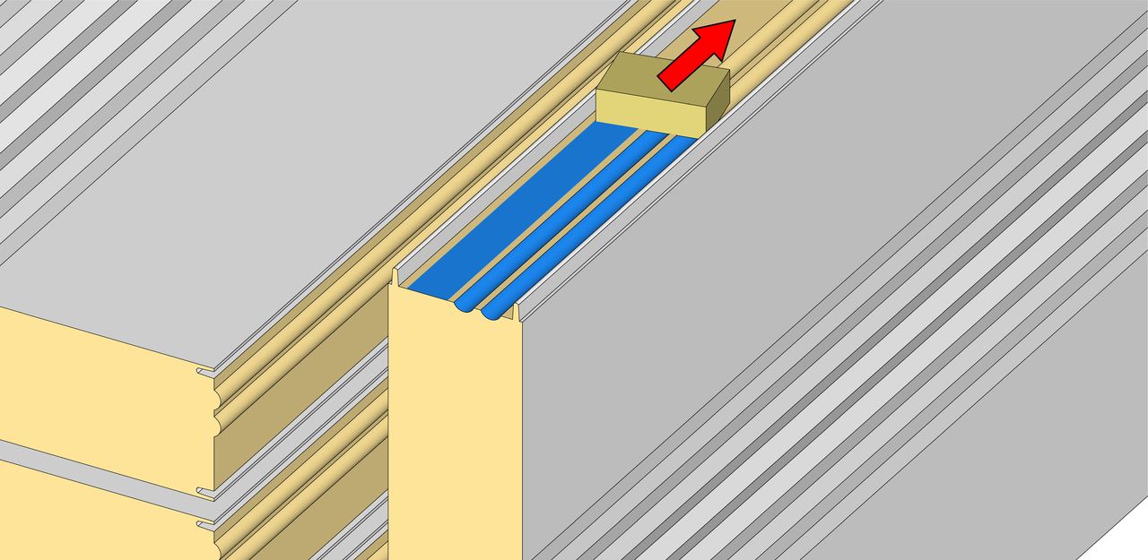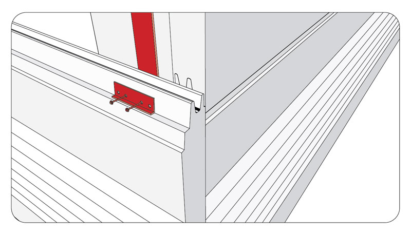 Mając wypoziomowaną i przykręconą pierwszą płytę, kolejna płyta nachodzi na nią na zasadzie pióro-wpustu, zakrywając tzw. noskiem zamek z elementami mocującymi.
