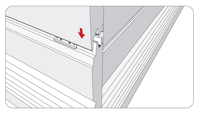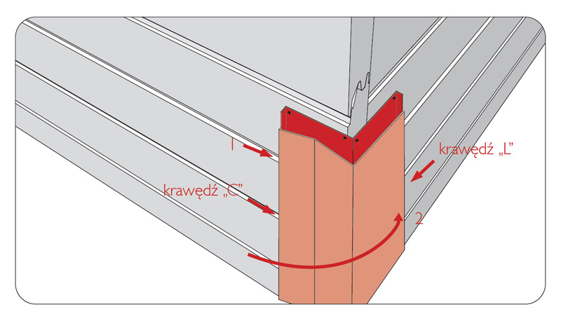Po takim przygotowaniu uchwytów montażowych można przystąpić do instalacji kątownika zewnętrznego 046. Jedna krawędź obróbki (z profilowaniem) jest zagięta w kształt litery „C”, druga (zmienna, nieprofilowana) w kształt litery „L”. Najpierw wprowadź krawędź „C” w szczelinę między okładziną płyty warstwowej a uchwytem pomocniczym (krok 1), a następnie ustaw obróbkę w taki sposób, aby po drugiej stronie zachować ok. 1mm przestrzeni między krawędzią obróbki a okładziną płyty (krok 2).