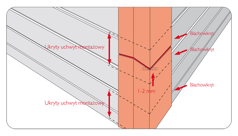 Po zamocowaniu płyt warstwowych do konstrukcji, montaż obróbek narożnych rozpoczyna się od rozmieszczenia, wypoziomowania i przykręcenia do okładzin płyt uchwytów pomocniczych 047.