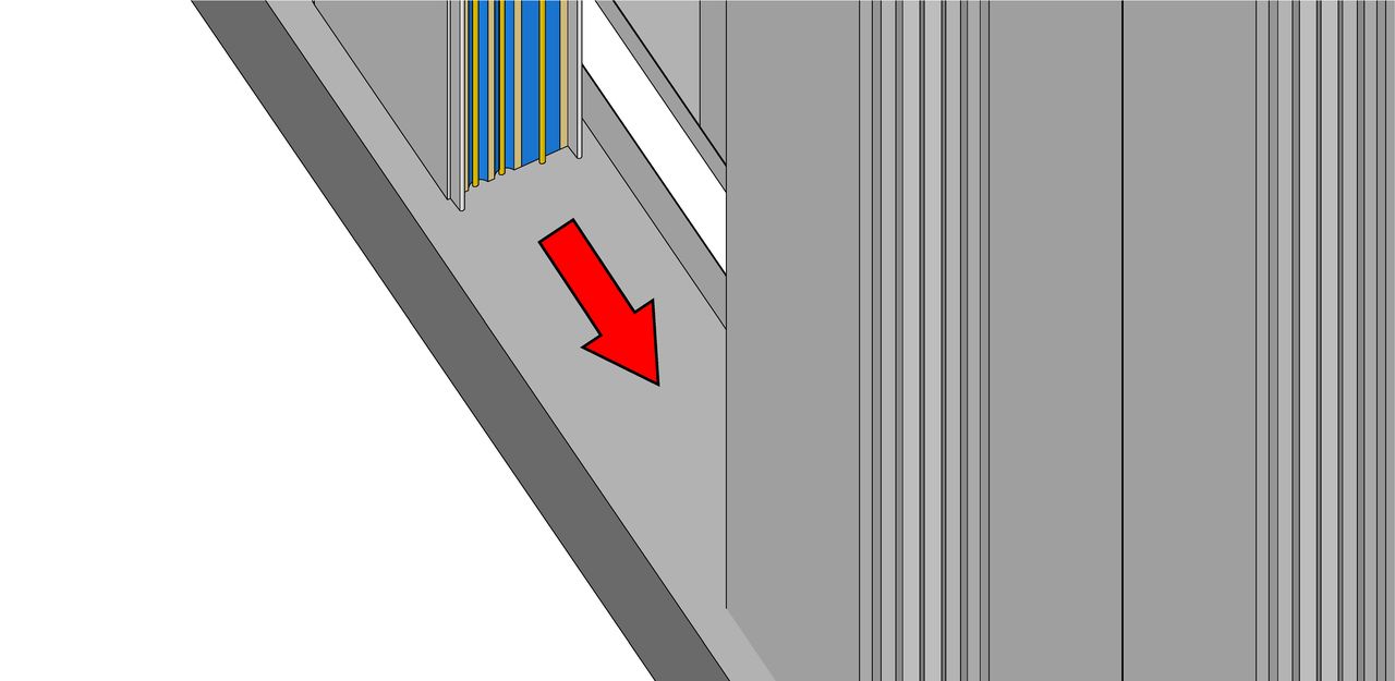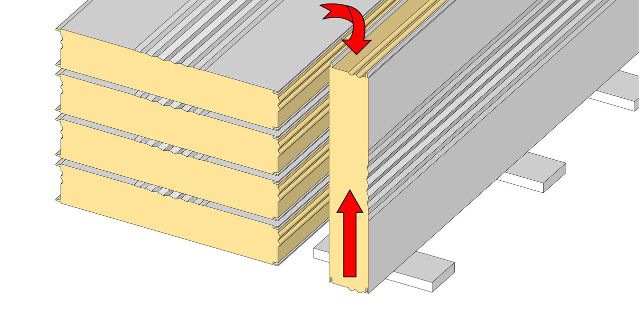 Pobrać płytę z pakietu, ustawić dłuższym bokiem na podłożu zabezpieczonym przekładkami styropianowymi. Pióra płyty (stalowy element zamka) mają być skierowane ku górze.